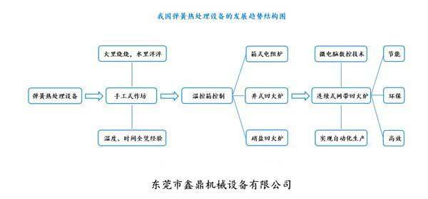 3、弹簧热处理设备的未来趋势。随着当前科技的进步,今后弹簧热处理设备的节能、环保与高效等技术指标会更高。比如说,与我们(国内热处理设备)相同大小的回火炉,网带宽度与长度相同,国外回火炉的用电功耗只有我们的2/3,不可思议的是对弹簧热处理的时间只是我们的一半。换句话说,国外同种规格的回火炉在能耗方面只有我们的1/3,在能耗方面是非常值得我们去借鉴与学习。然而,我们在节能方面还大有文章可做,譬如采用更先进加热元件,更好的保温材料和更精确的温度控制等措施,以期达到节能与高效的目的。环境保护已成为国际关切的话题,无论是当前还是未来的发展,我们对环境保护的要求也会越来越高。因此,在回火炉上添加油烟净化装置已成为发展的必然趋势,可以帮助我们有效地减少对环境的污染。如果您想了解我国压簧机领域中最具竞争优势的生产厂家,请点击[文章]东莞压簧机选鑫鼎,产品一站式服务提供商。